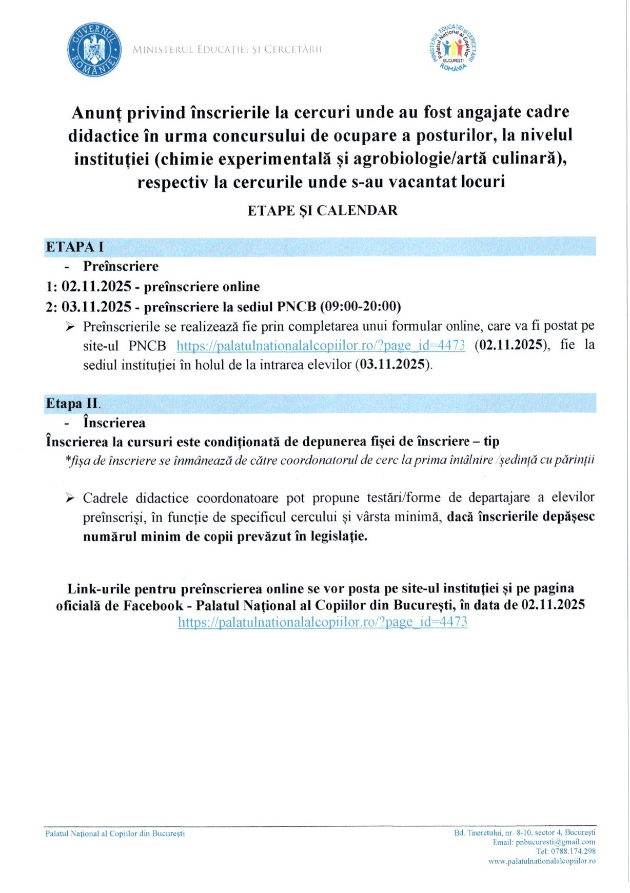 Anunț privind înscrierile la cercuri unde au fost angajate cadre didactice în urma concursului de ocupare a posturilor, la nivelul instituției (chimie experimentală și agrobiologie/artă culinară), respectiv la cercurile unde s-au vacantat locuri